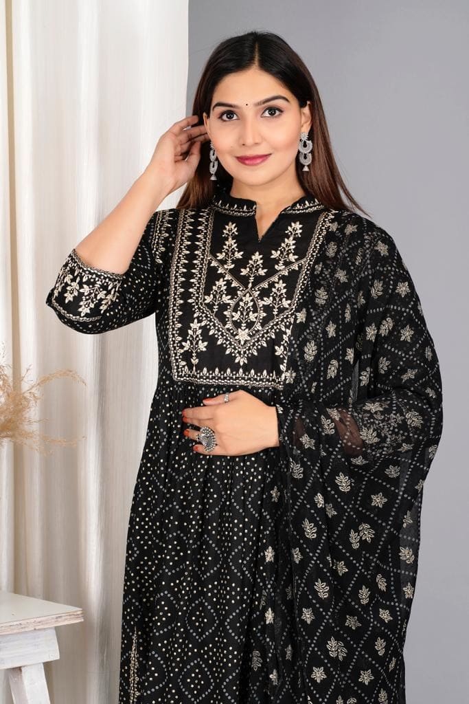 This stunning three-piece ensemble features a premium rayon kurti in a captivating Nyra cut. The full-flare Anarkali silhouette flatters your figure, while intricate embroidery adds a touch of luxury. The chic mandarin collar and 3/4 sleeves offer a sophisticated touch.
