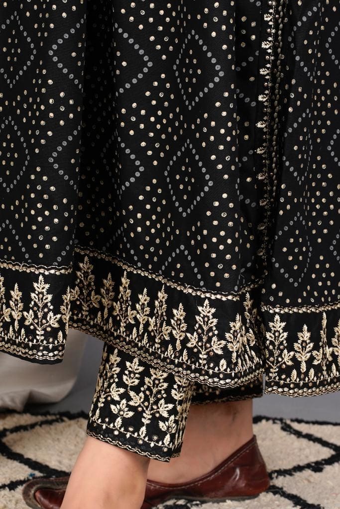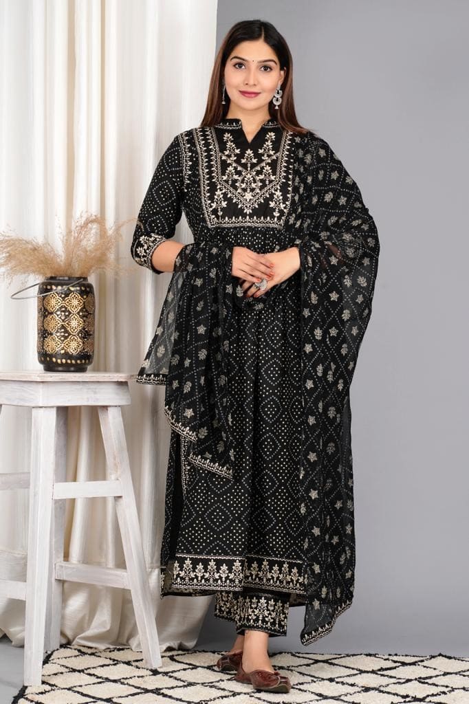 The set includes a pair of matching rayon embroidered pants and a beautifully printed dupatta, all in a captivating black color.