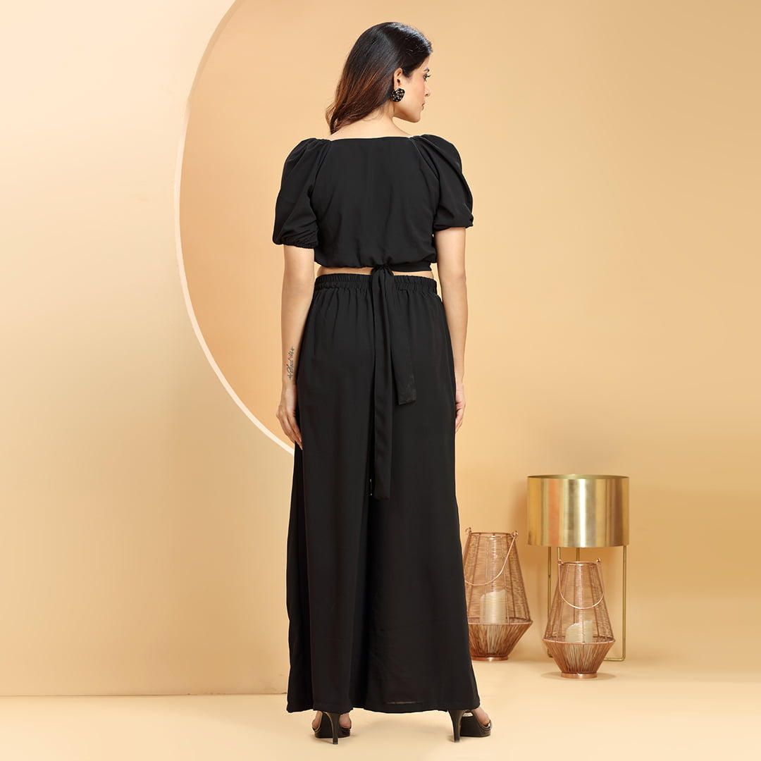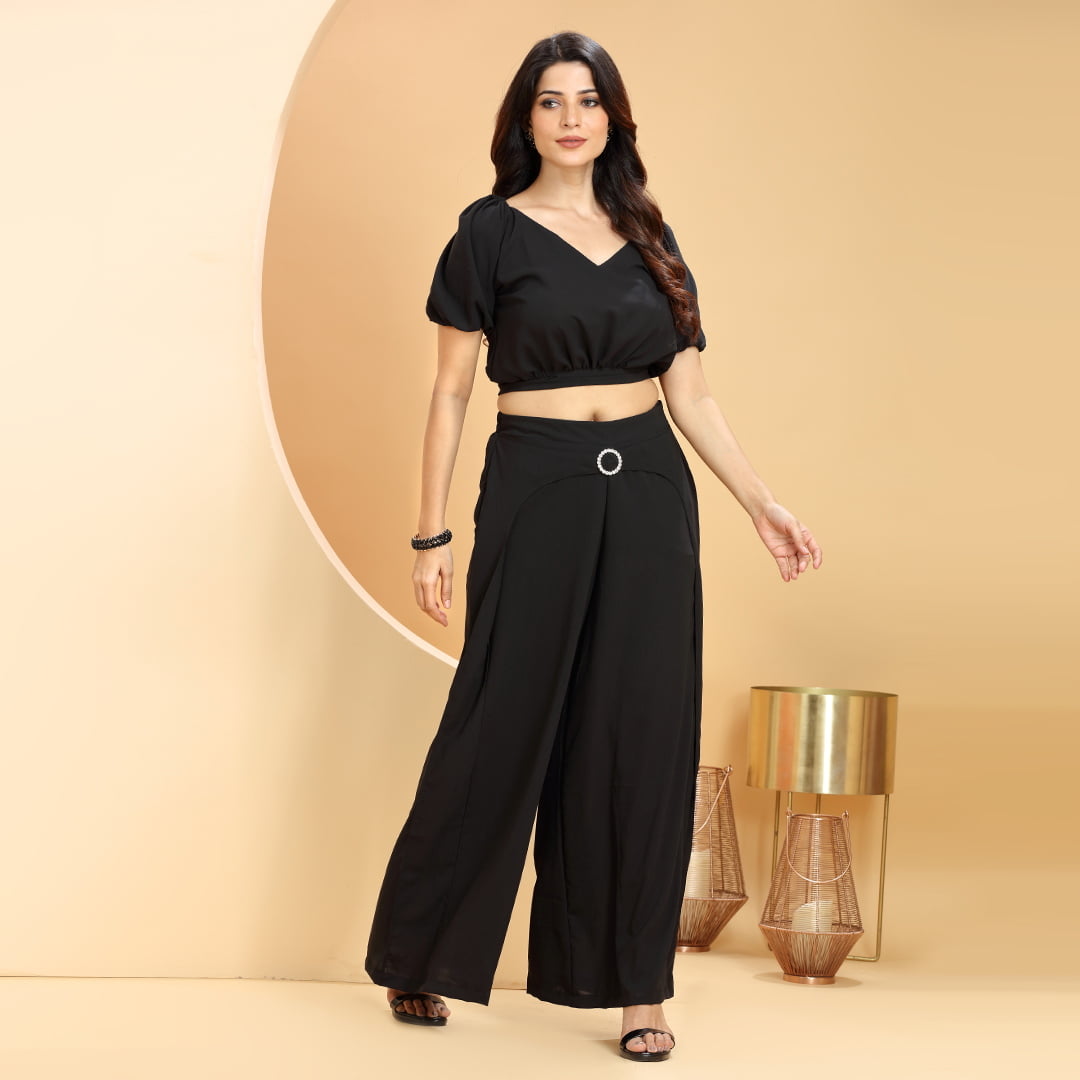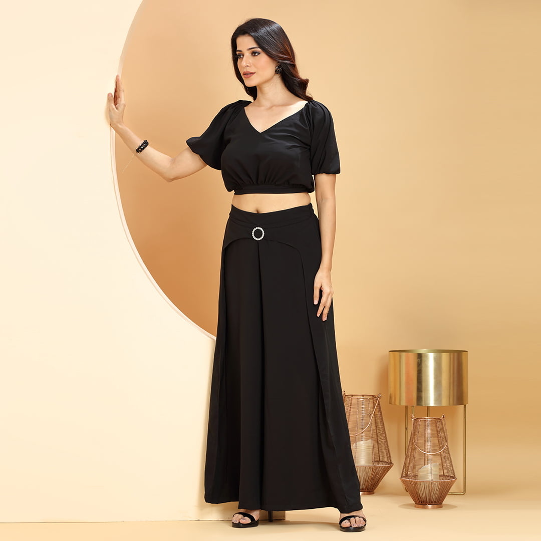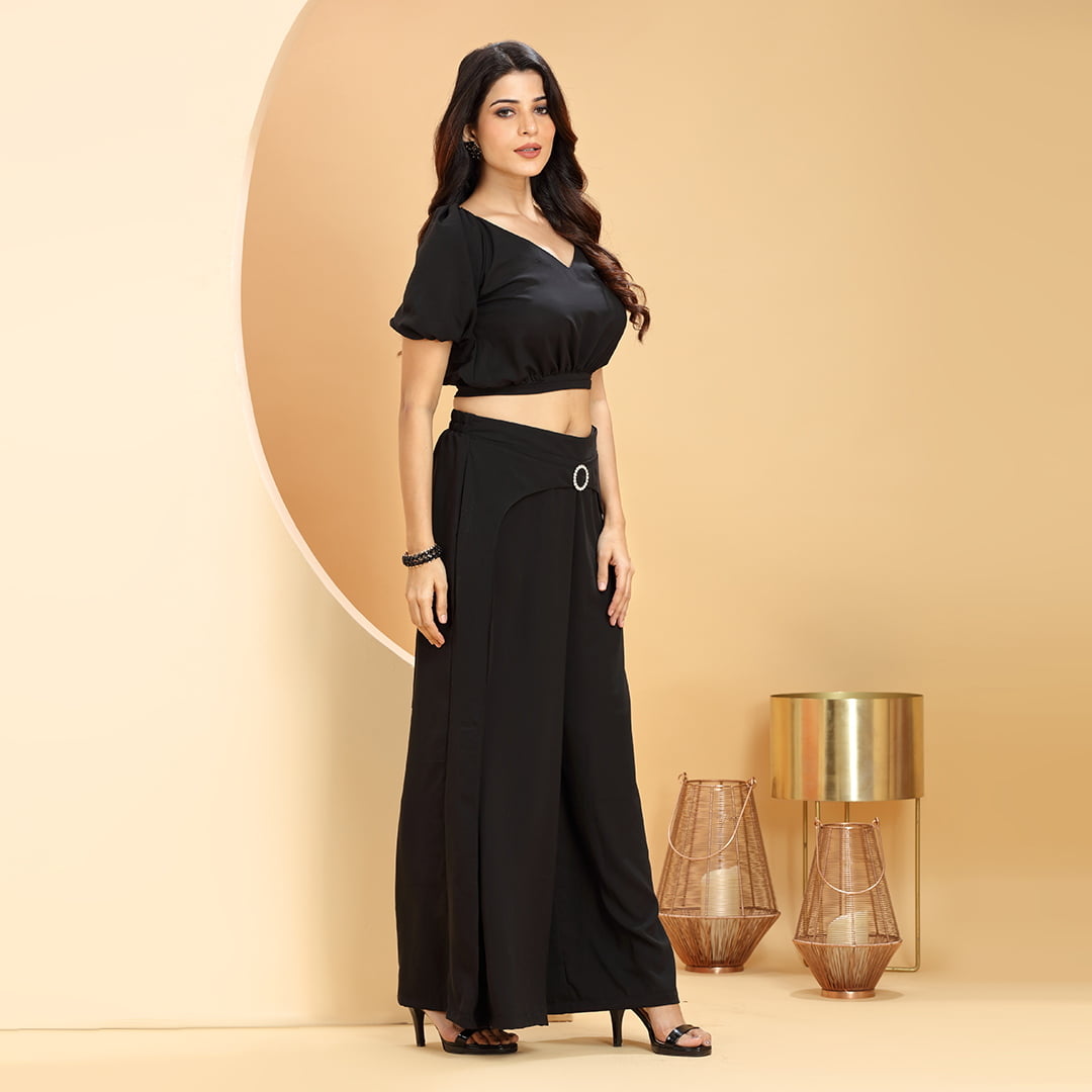 | Style | •Crop top with elastic at the waist and sleeves •Attached belt which can be tied at the back •Flared wide legged pants with a diamond studded buckle |