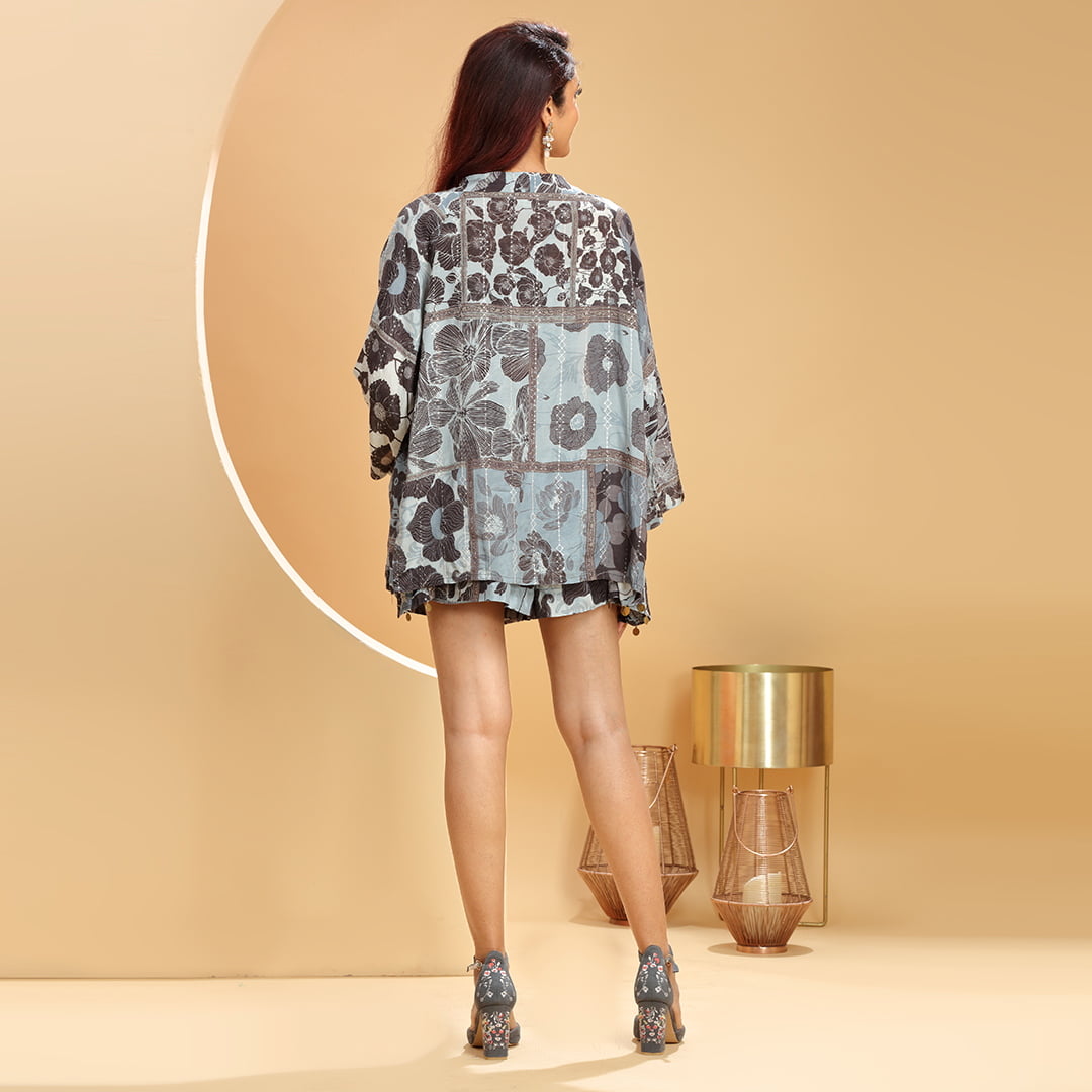 This set includes a chic spaghetti blouse and comfortable shorts, perfect for a relaxed yet stylish look. The full-sleeve shrug, adorned with coin hangings along the edge, adds an ethnic charm to your outfit. The shrug is beautifully embellished with sequins and thread embroidery, making it versatile for various occasions.