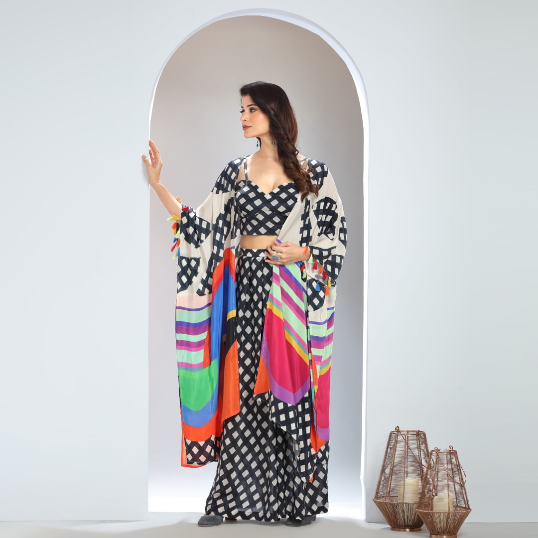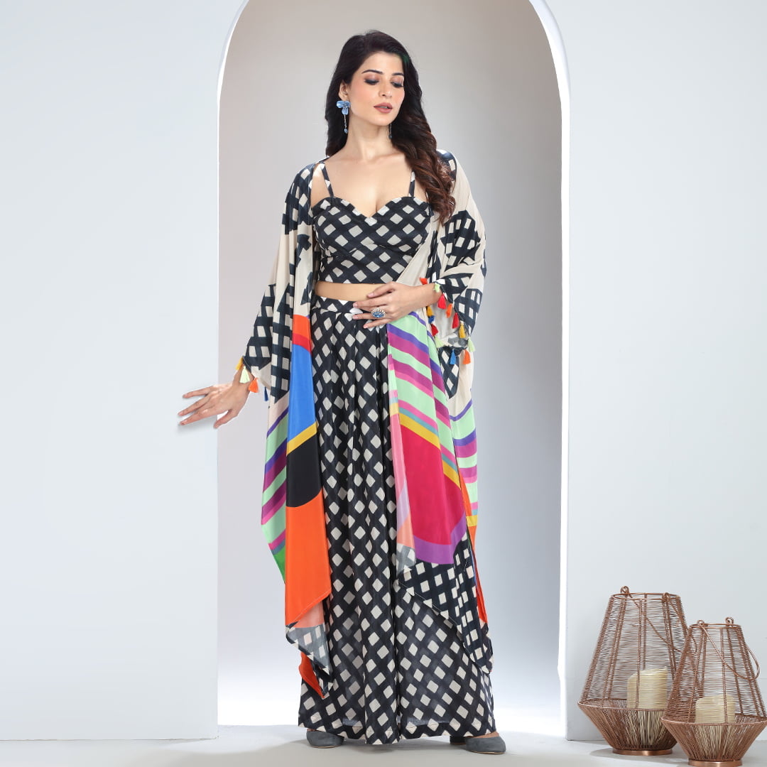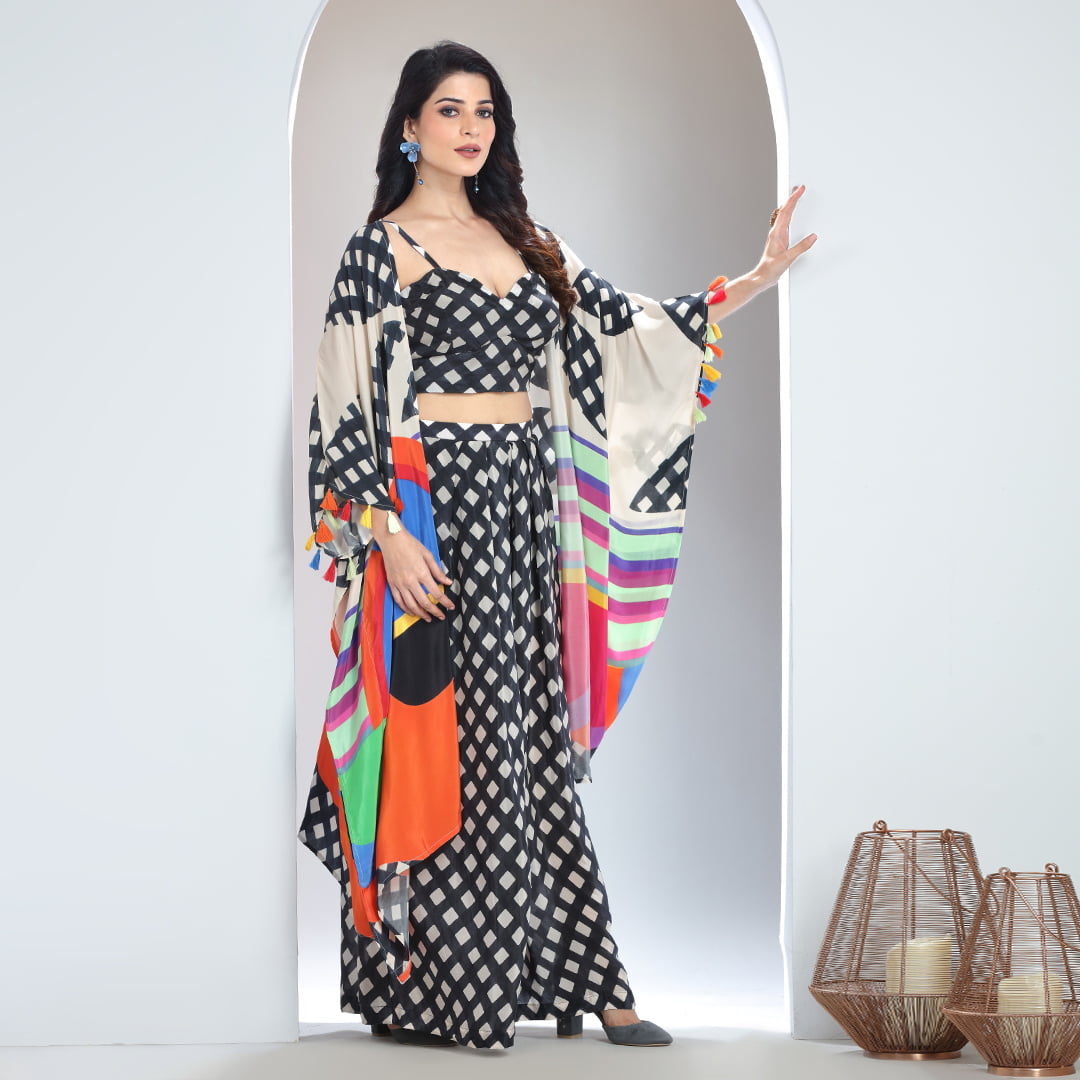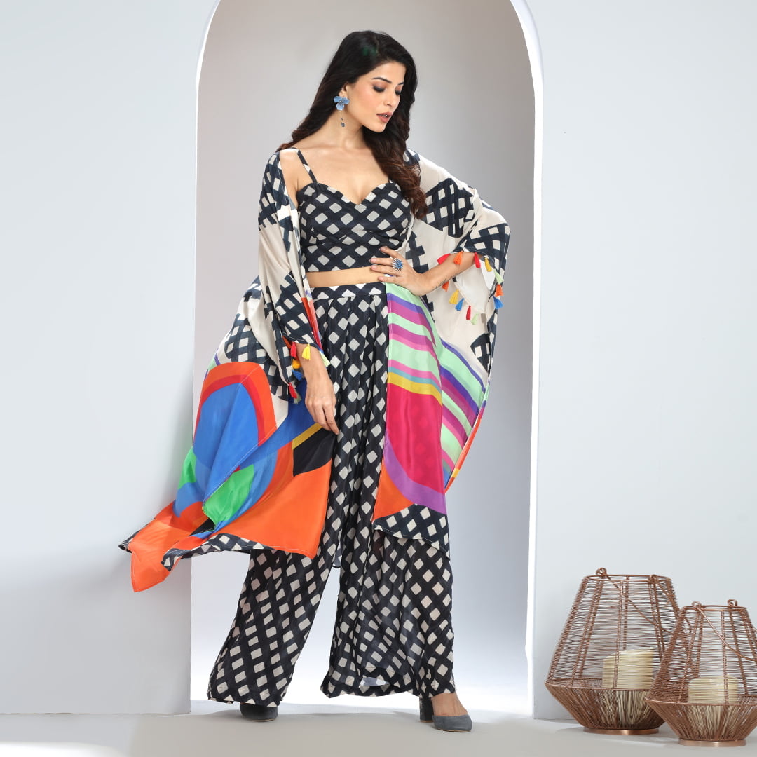 Gulal Couture Chic Monochrome Co-Ord Set with Vibrant Cape