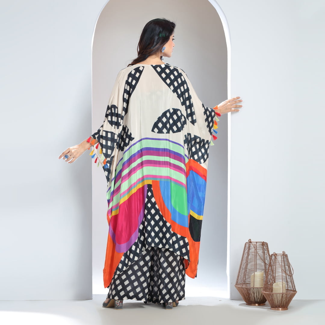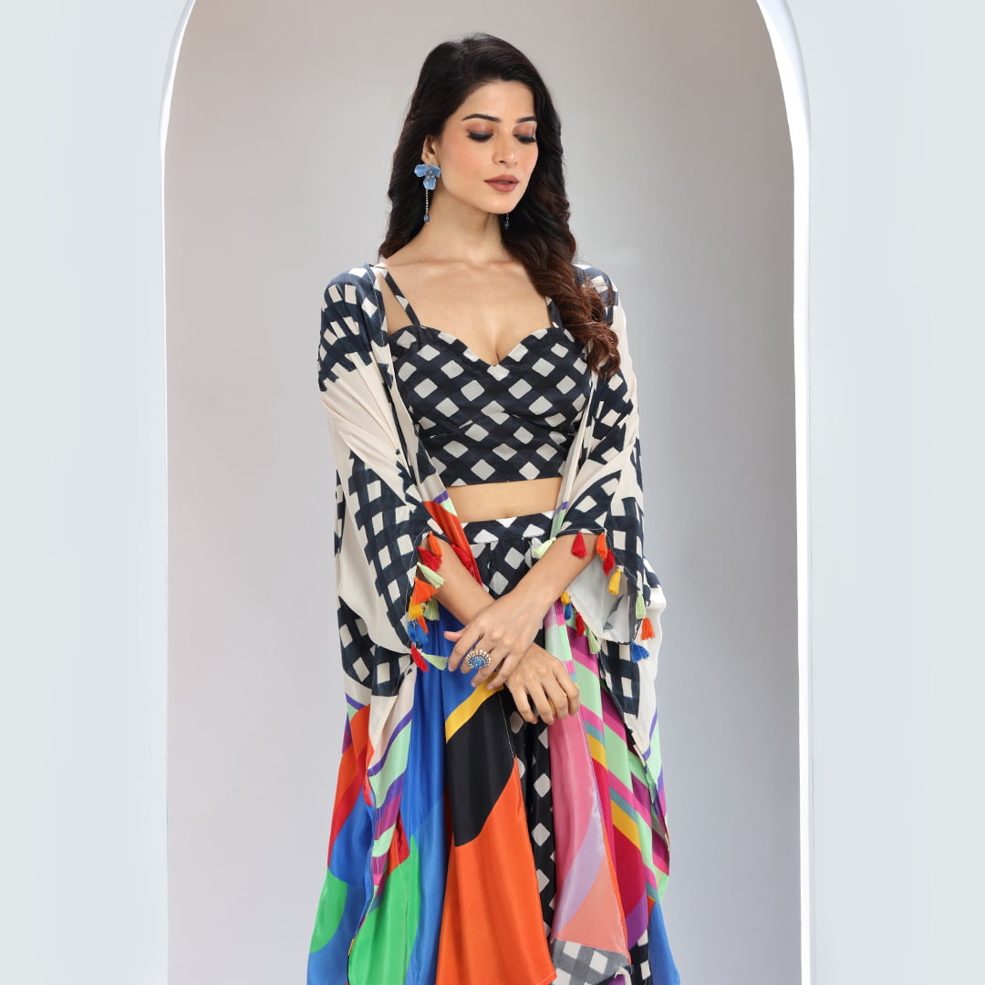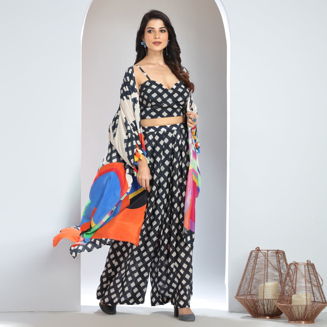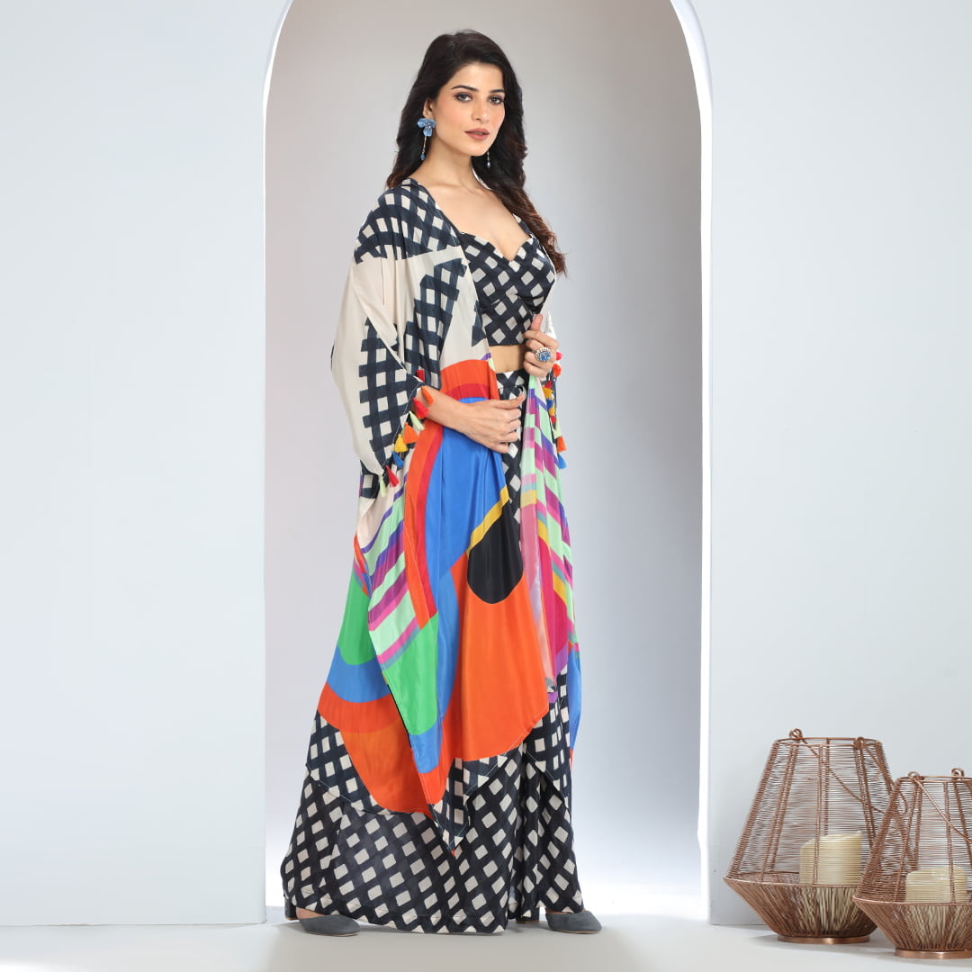 Gulal Couture Chic Monochrome Co-Ord Set with Vibrant Cape