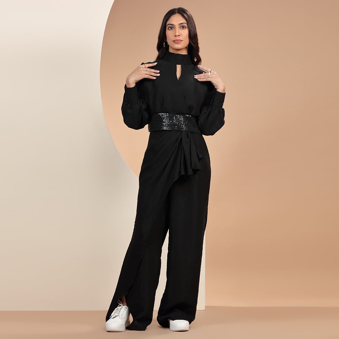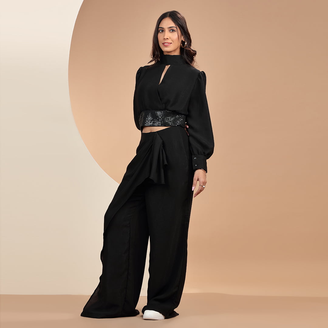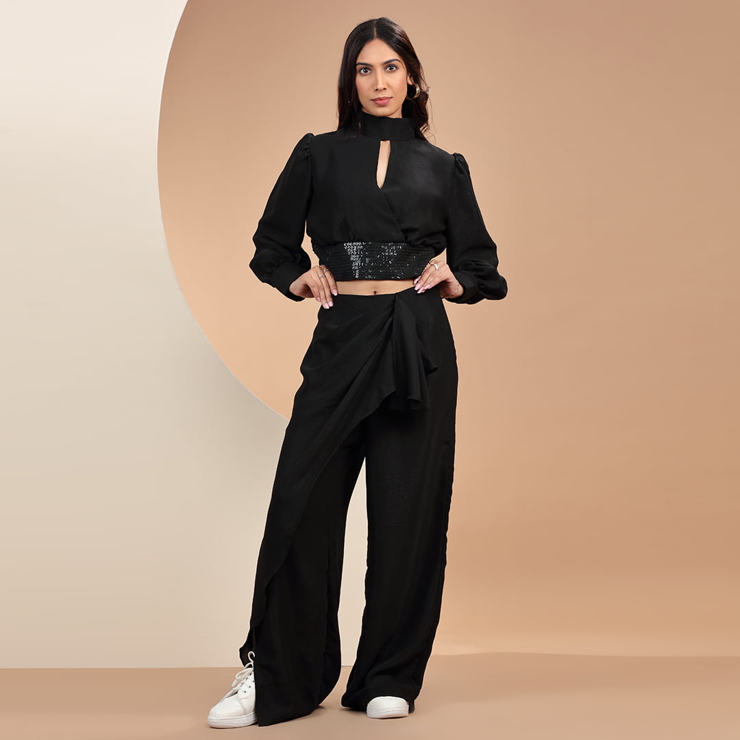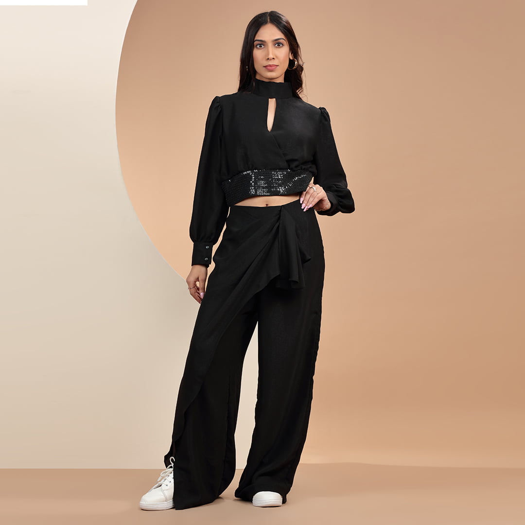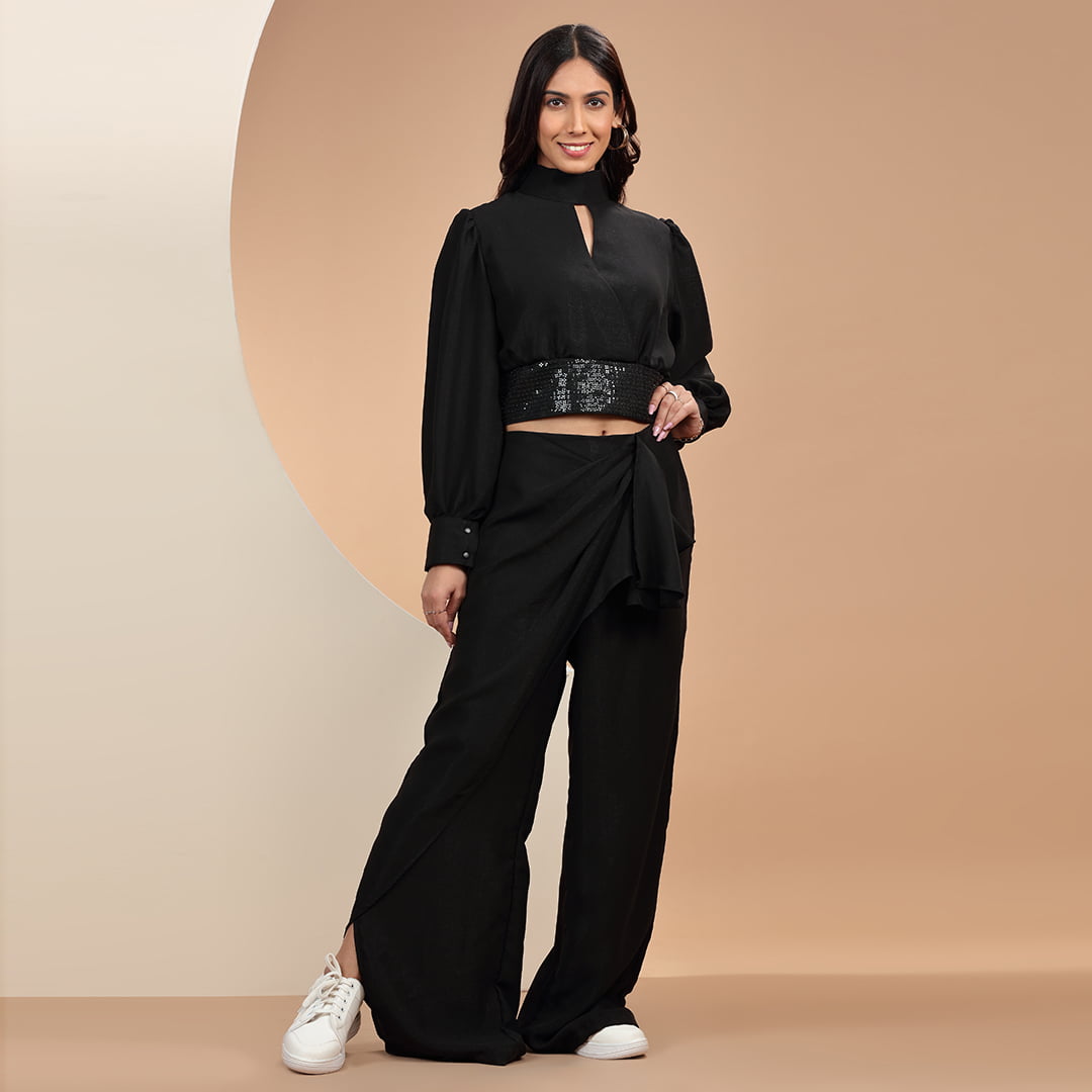 Discover versatile sophistication with Gulal Couture’s Midnight Elegance Two-Piece Set. This sleek ensemble features a black balloon-sleeved top with a subtle keyhole accent and complementary wide-legged trousers, adorned with a shimmering attached sequined belt for a refined touch. Crafted for the modern woman, the fluid fabric ensures comfort without compromising on style, perfect for transitioning from a day at the office to an evening affair.