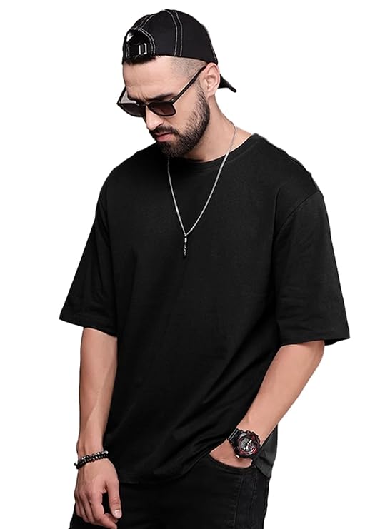 Elevate your casual look with the LEOTUDE Oversized Black T-Shirt for Men. This relaxed tee features a comfortable drop shoulder design and a clean, solid black color for effortless style. Crafted from a soft and breathable cotton blend fabric, this t-shirt offers long-lasting comfort you can move in.