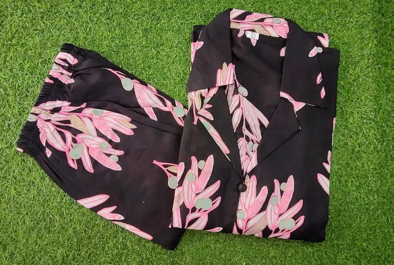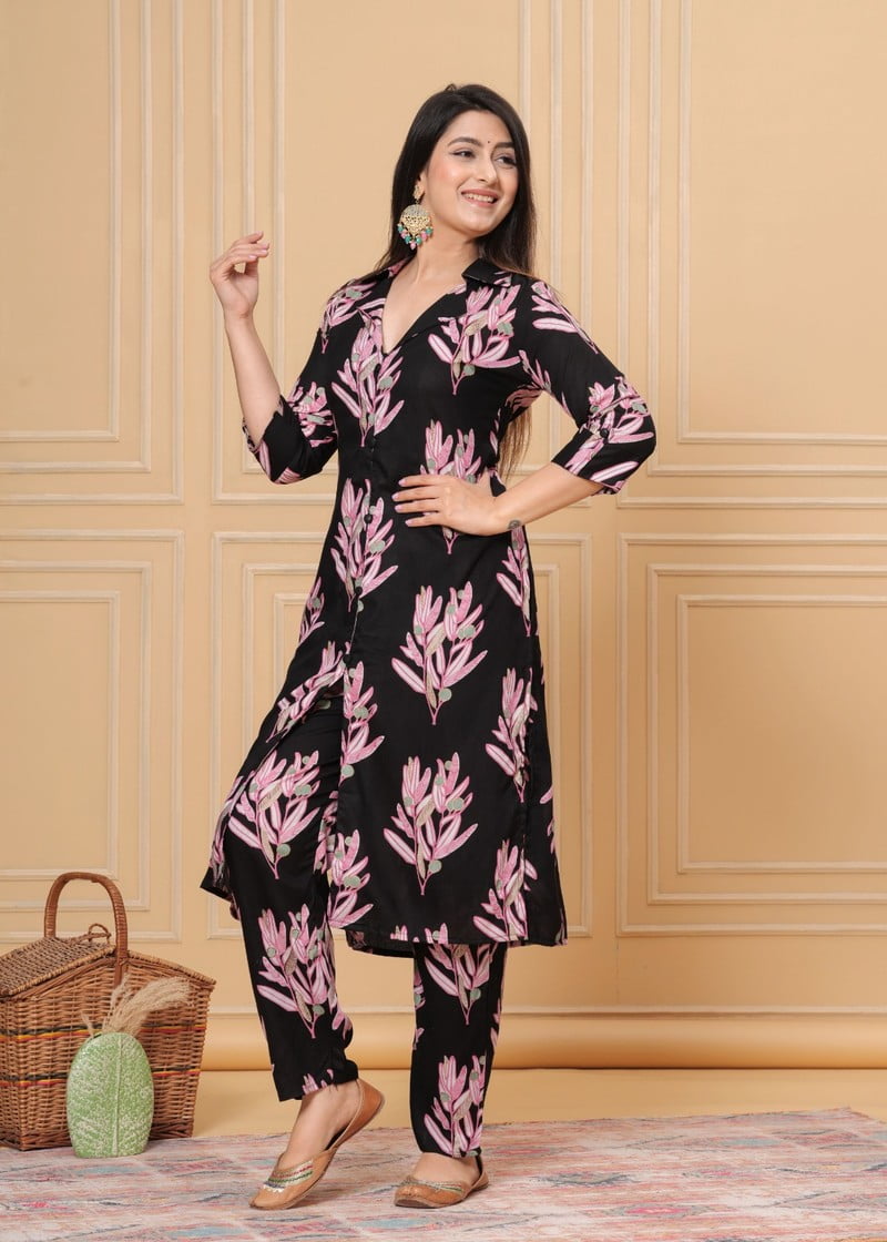 Effortlessly elevate your style with this Rayon Digital Printed Cord Set. This chic two-piece ensemble features a stunning black digital print on comfortable rayon fabric. The collared neckline and 3/4 sleeves add a touch of sophistication, while the co-ord style ensures a perfectly coordinated look.