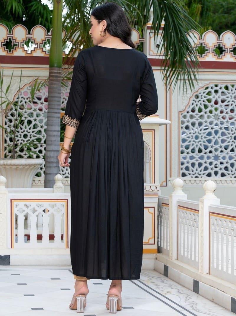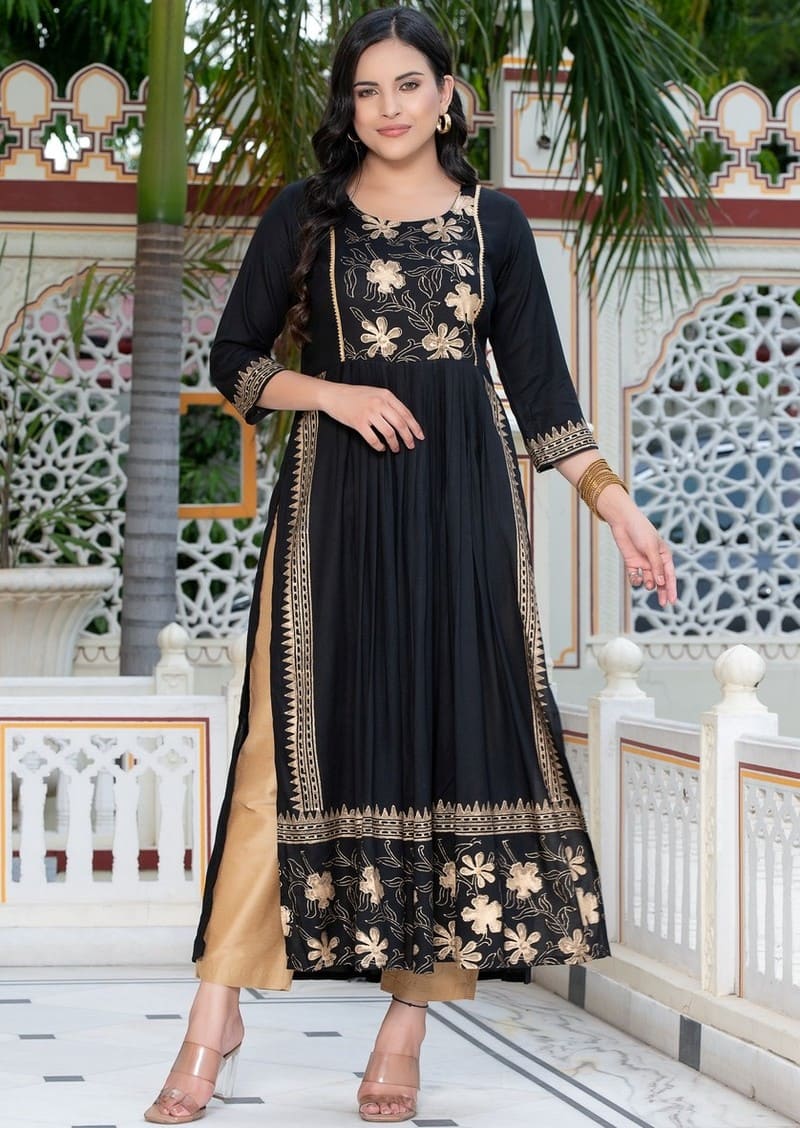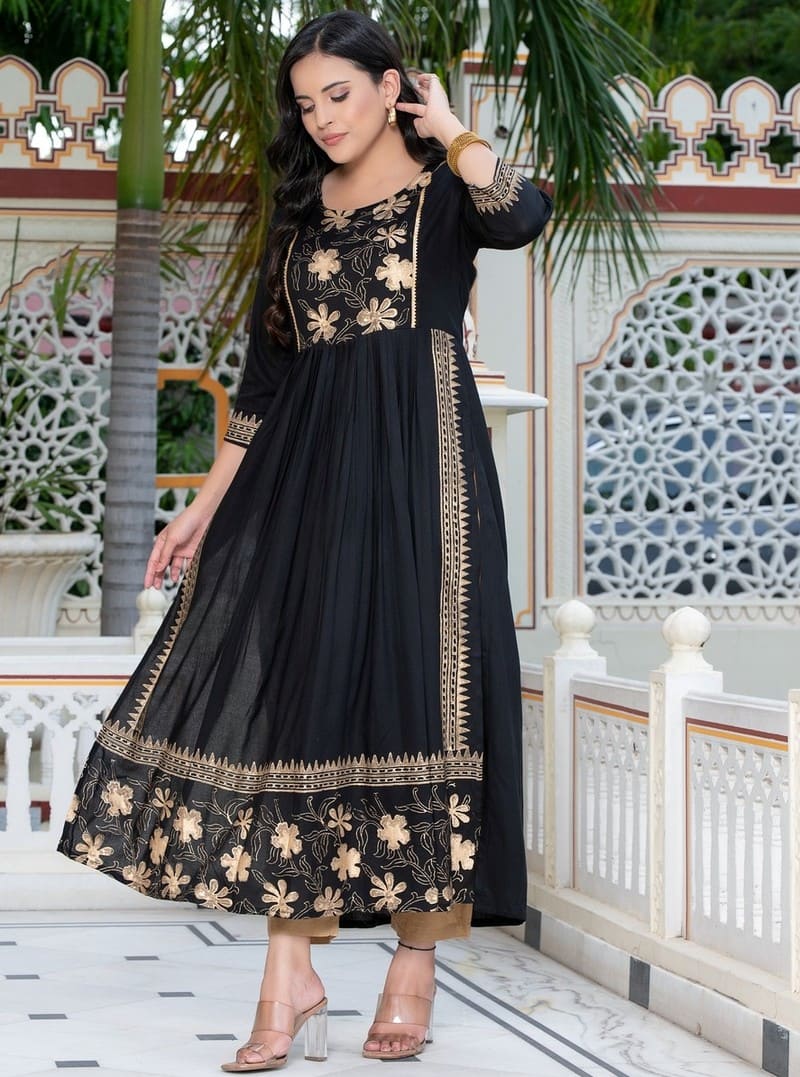 Dress comfy and cute with this Fbella Black Rayon Kurti! This straight-cut kurta is made from soft rayon fabric, perfect for keeping you cool. It’s decorated with a unique all-over print, made by hand using special blocks! Enjoy free shipping and easy returns!