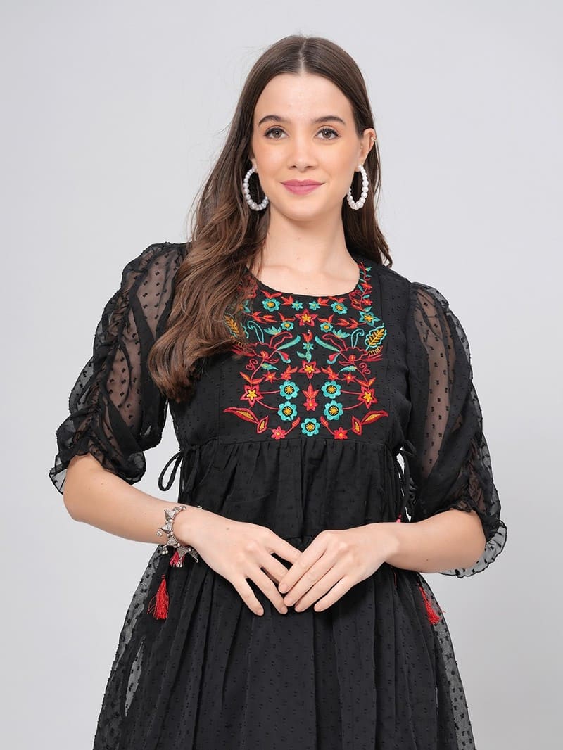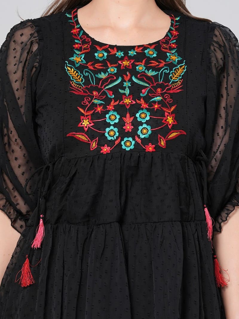 Look effortlessly stylish in this flowy black dress from Fbella! The comfy georgette fabric with a textured weave creates a light and airy feel.
